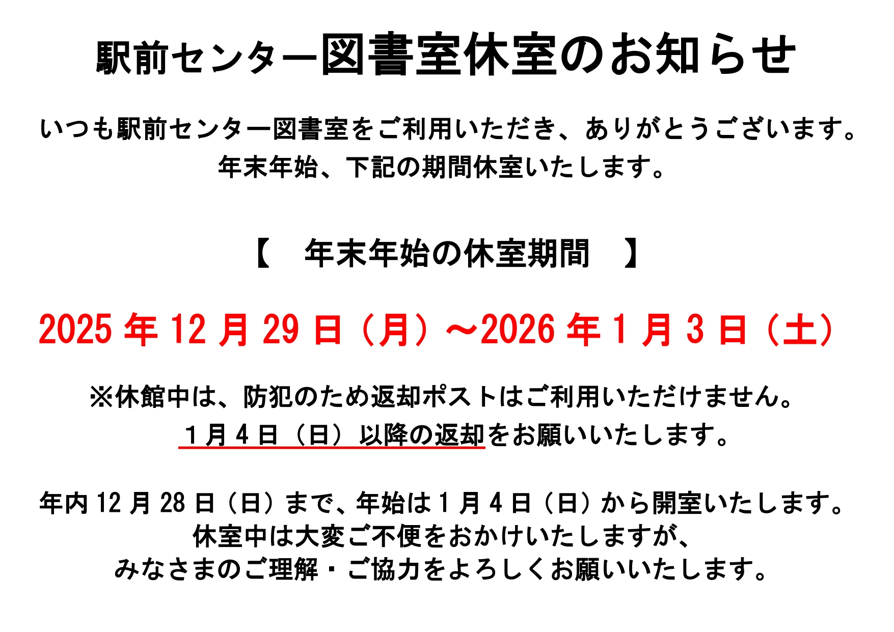 【年末年始の休室期間】