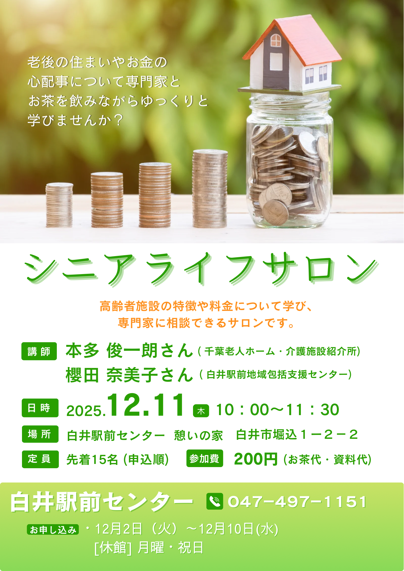 シニアライフにまつわる住まいやお金の心配事を、専門家と気軽にお話しできるサロンです。