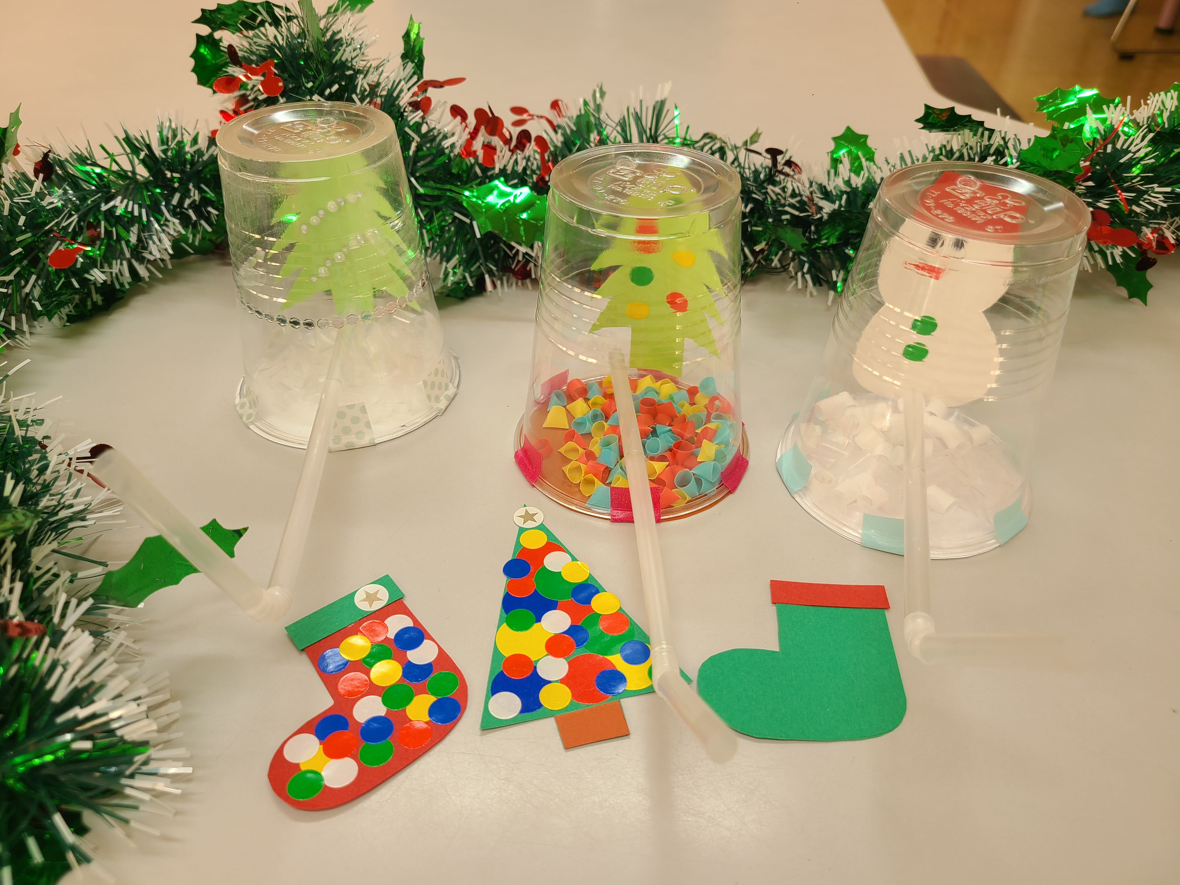 ツリーとブーツのパーツにシールをたくさん貼り、細かく切ったストローをカップに入れて、蓋をしてストローを1本差し込んだら、スノードームの出来上がりです★